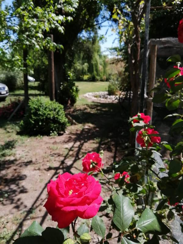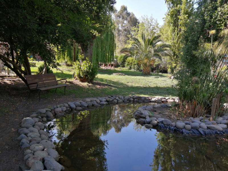 En su exterior posee 3500 m2 de un hermoso jardín con terraza, piscina de 3, 40 metros de diámetro y una pequeña laguna. Además cuenta con 4000 m2 de terreno cultivable.
